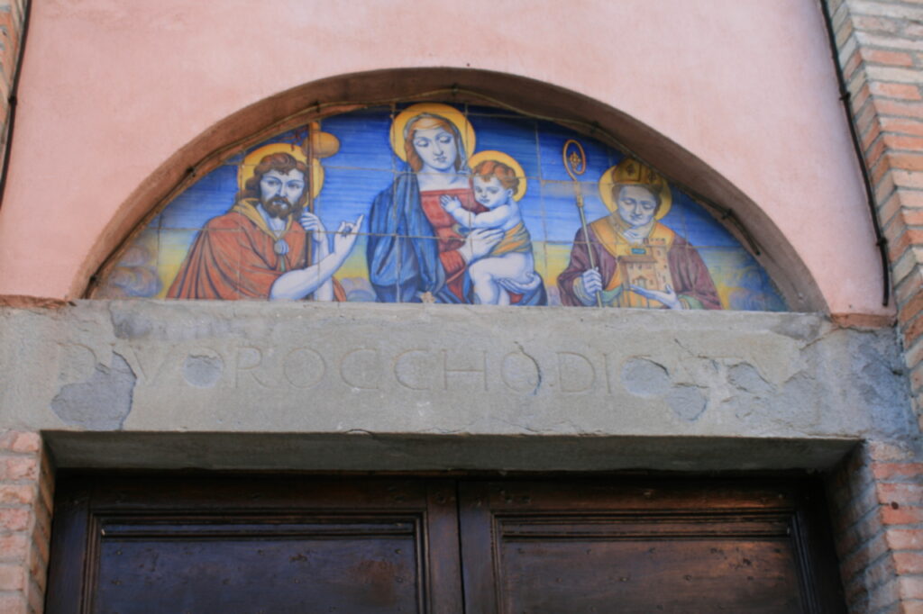 entro lunetta, Madonna con Gesù Bambino, tra san Rocco e sant’Emidio (1926), in ceramica maiolicata di bottega derutese: l’opera sostituisce l’originale di Elpidio Petrignani, attualmente collocato nella controfacciata, sopra il portale, all’interno della bussola.
